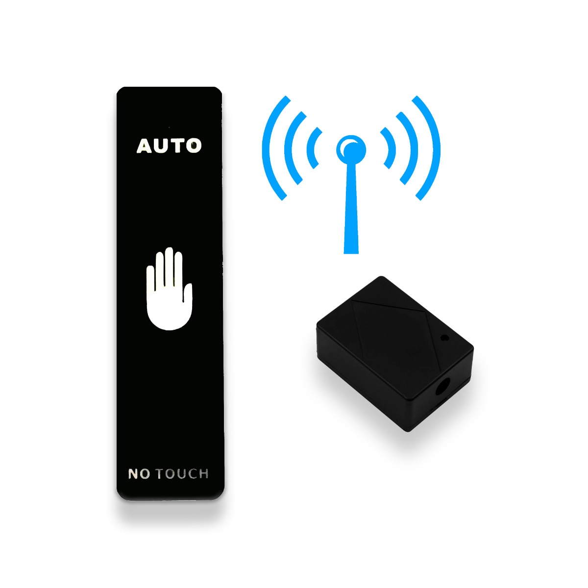Bouton poussoir sans contact en acrylique noir, fonctionnant sans fil par liaison relais.