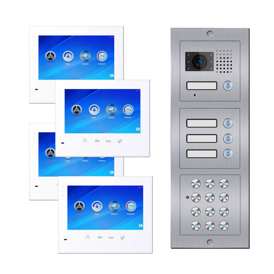 Portier visiophone pour 4 logements avec clavier à code et 4 écrans couleur 7 pouces, fonction mémoire photos.