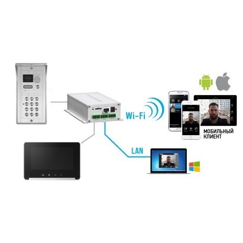 Module IP permettant de rediriger la conversation d’un visiophone analogique Evoya 4 fils sur tout appareil mobile fonctionnant sous Android ou iOS et ordinateur Windows.
