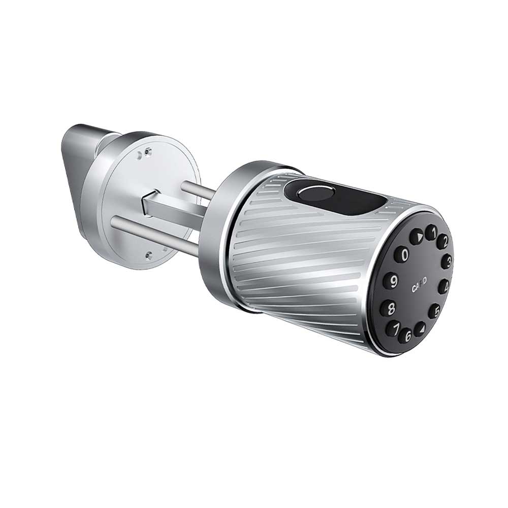 Poignée de porte ronde NS-20 avec clavier à code, lecteur biométrique et RFID.