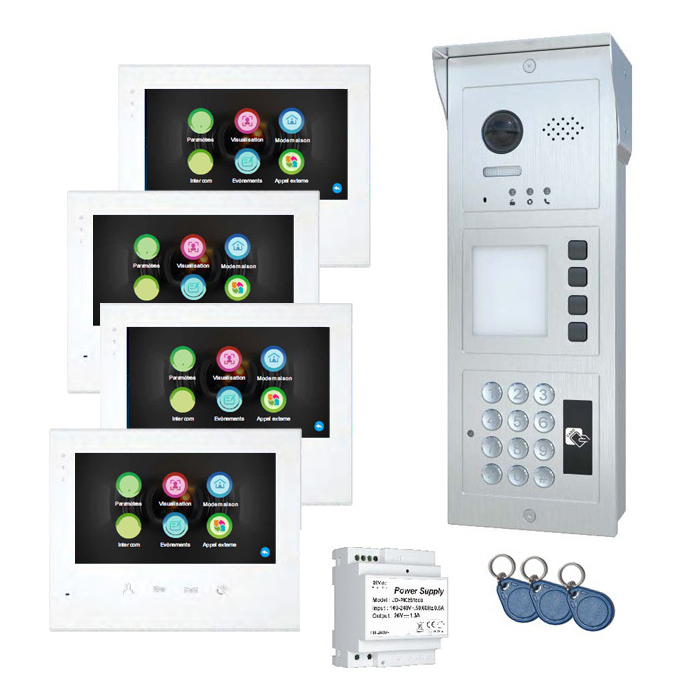 Kit tout-en-un comprenant 4 moniteurs tactiles 7 pouces WIFI Full HD 1080P et une platine de rue modulaire équipée de 4 boutons d'appel indépendants avec lecteur RFID.