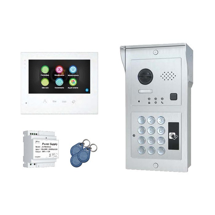 Kit complet comprenant un moniteur tactile 7 pouces Full HD 1080P avec connexion WIFI et une platine de rue modulaire équipée d'un clavier digital et lecteur RFID.